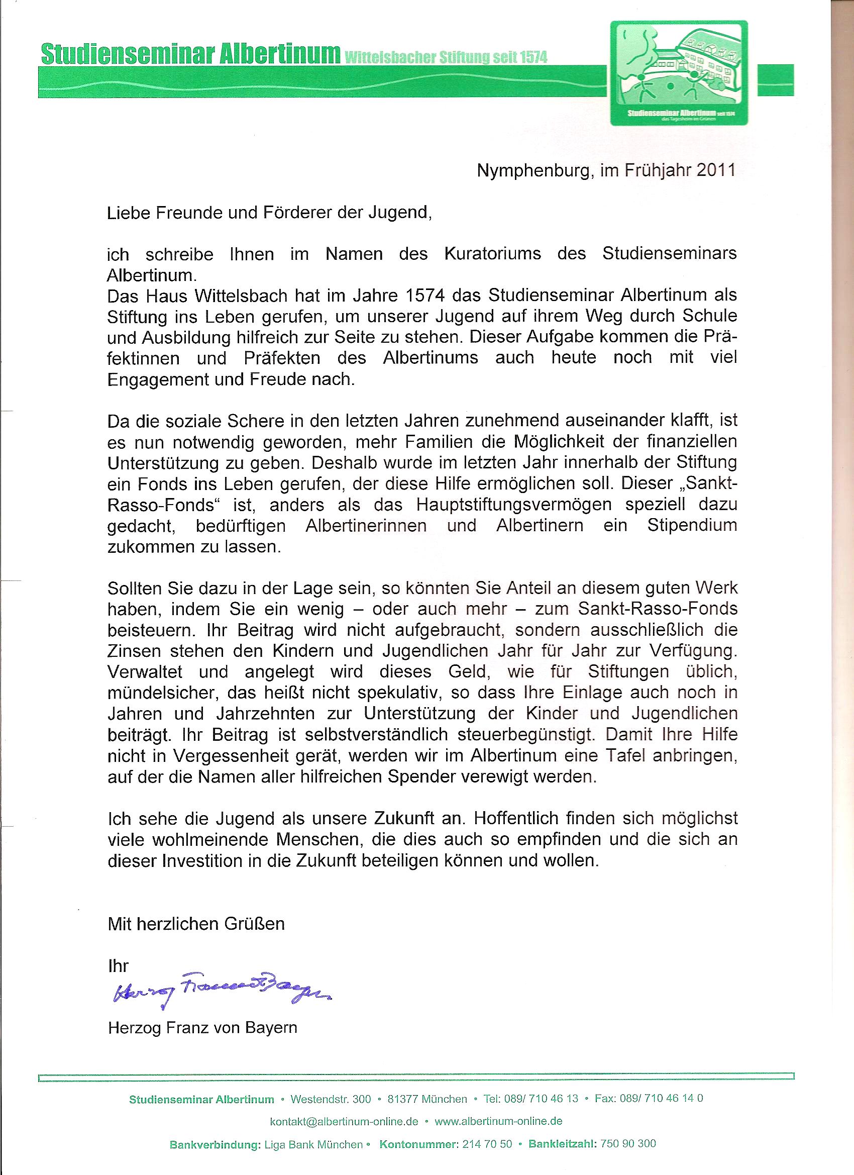 Wer etwas für Kinder in Nöten tun und dabei noch Steuern sparen will, der möge bitte hier einmal nachsehen (Hl.Rasso-Fonds-Download). Sogar Herzog Franz von Bayern empfiehlt diese Einrichtung (Empfehlung Herzog Franz von Bayern).